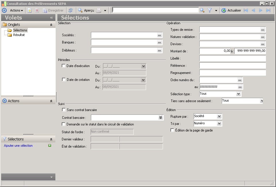 (Sage FRP 1000 Banque Paiement) Menu Banque Paiement > Ordres bancaires > Consultation des ordres par type > Consultation des Prélèvements SEPA