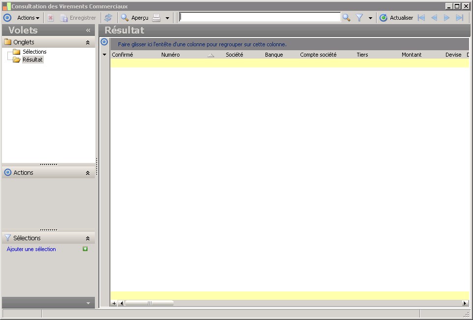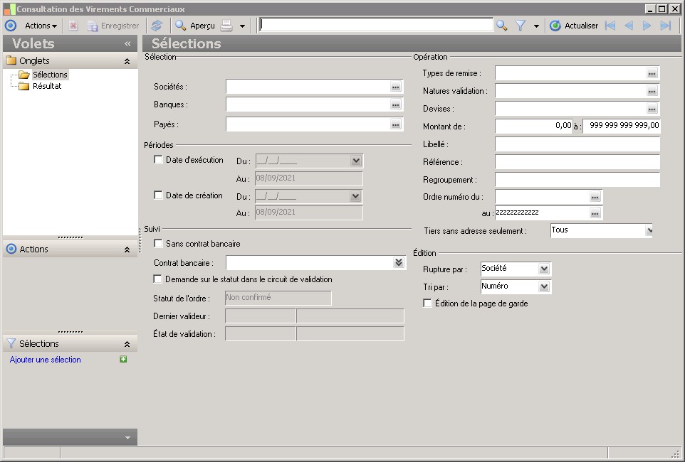(Sage FRP 1000 Banque Paiement) Menu Banque Paiement > Ordres bancaires > Consultation des ordres par type > Consultation des Virements Commerciaux