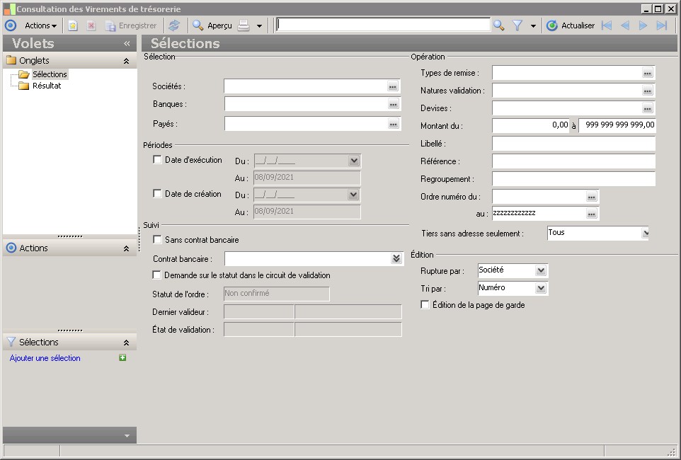 (Sage FRP 1000 Banque Paiement) Menu Banque Paiement > Ordres bancaires > Consultation des ordres par type > Consultation des Virements de trésorerie