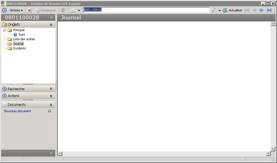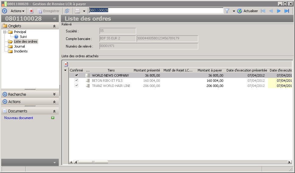 Cette classe référence l'ensemble des LCR à payer (Traites ou billets à ordre)Les LCR à payer sont émises par la banque et intégrées dans Sage 1000 Banque paiement afin d'y être traitées. Les LCR à payer issues d'un même fichier d'intégration sont constitutives d'une même remise bancaire. Le traitement d'une LCR à payer consiste à soit valider son paiement (total ou partiel) soit indiquer le refus de paiement (rejet). Ce traitement s'effectue dans le cadre du circuit de validation de la remise (validation des remises LCR à payer).La remise ne peut être envoyées à la banque qu'à partir du moment où son état final est atteint. Il est possible de n'envoyer à la banque que les remises présentant une ou plusieurs LCR refusées ou payées partiellement (notion d'accord tacite pour les LCR à payer défini au niveau du contrat bancaire). |