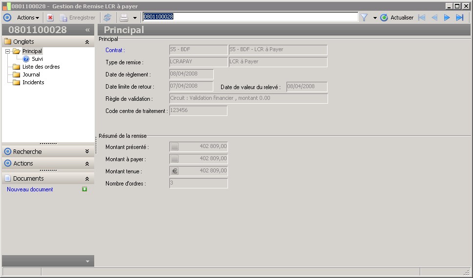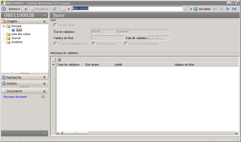 L'état valide d'une remise autorise sa transmission à la banque. Cet état est défini par la validation du dernier état du circuit de validation de la remise. En l'absence de règle de validation à appliquer sur la remise, celle-ci est considérée comme valide dès sa création.Ce n'est pas le statut valide de la remise qui empêche l'ajout d'ordres à celle-ci : c'est le statut généré qui détermine cela (cf. statut généré de la remise pour connaître le moment de génération du fichier de la remise).Il reste néanmoins possible de ré-initialiser la remise afin d'y ajouter de nouveaux ordres. Cette procédure exceptionnelle a pour effet de la remettre à l'état initial de son circuit et de supprimer le cas échéant le fichier généré. Les ordres qui composent la remise sont conservés au niveau de celle-ci.Une remise valide peut être supprimée : les ordres qui la composent seront alors disponibles pour la constitution d'une nouvelle remise. |