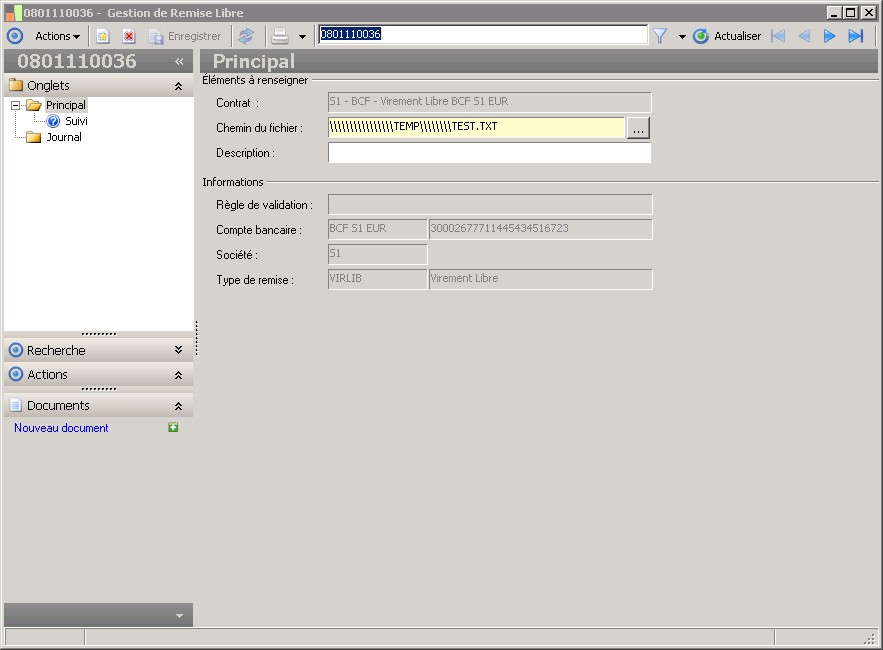 Cette zone obligatoire indique le chemin du fichier à envoyer dans le cadre d'une remise de virements libres.Notez que ce chemin n'est plus modifiable lorsque la remise a commencé son circuit de validation. |