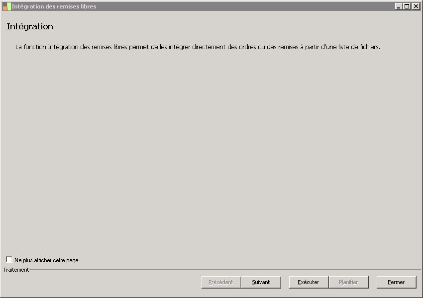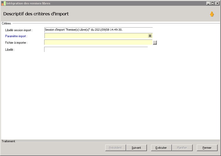 Remise de virement libre.Cette remise est saisie par l'utilisateur, elle est utile lorsque l'utilisateur souhaite envoyer un fichier dant le format est inconnu à MP1000.Il renseigne un contrat, un fichier. |