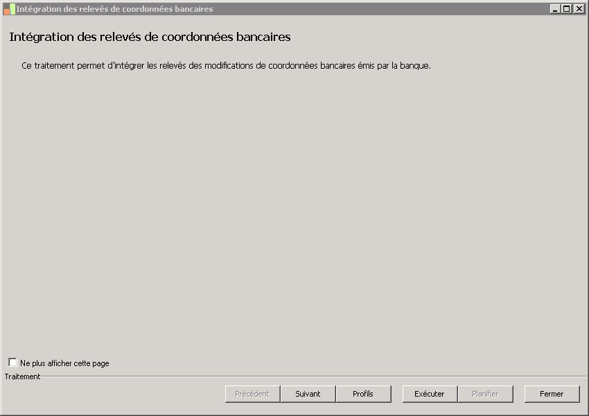 (Sage FRP 1000 Banque Paiement) Menu Banque Paiement > Relevés et Notifications > Relevés de coordonnées bancaires > Intégration des relevés de coordonnées bancaires