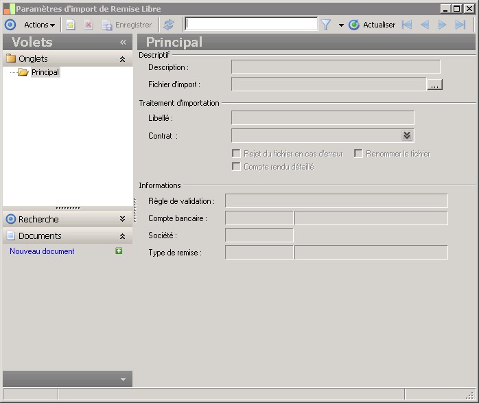 (Sage FRP 1000 Banque Paiement) Menu Banque Paiement > Paramètres > Paramètres d'import de Remise Libre