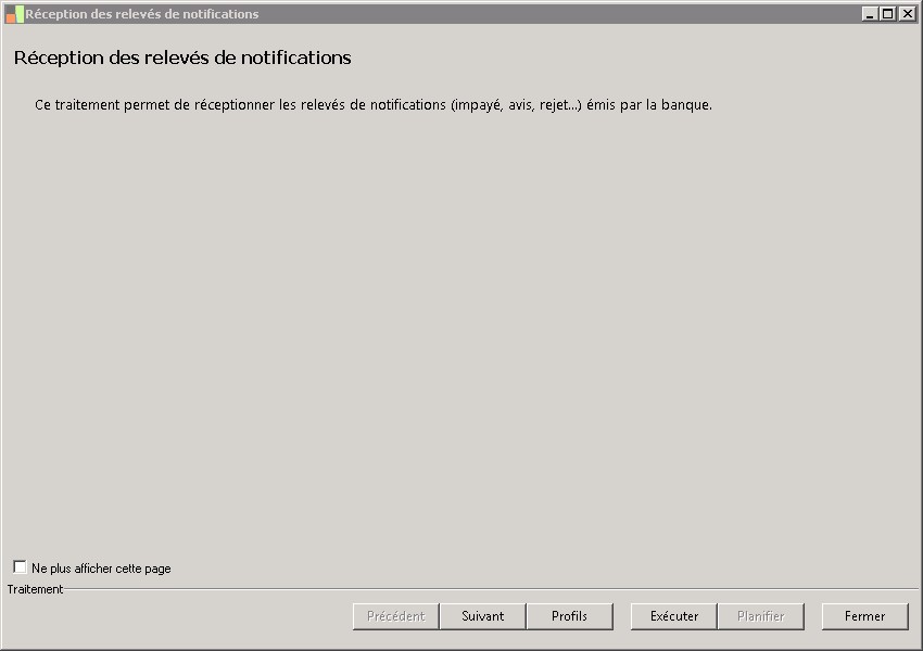 (Sage FRP 1000 Banque Paiement) Menu Banque Paiement >  Relevés et Notifications >  Relevés de notifications >  Réception des relevés de notifications
