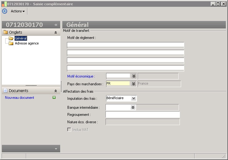 Cette zone mentionne le motif économique pour lequel l'ordre est passé.Le motif économique (également dénommé nature économique) est nécessaire pour la déclarations à la Balance des paiements des ordres passés avec des tiers non résidents.Sont déclarables à la Balance des paiements, les ordres passés avec des tiers non résidents (payeur et payé ne résidant pas dans le même pays) dont le montant de transaction est supérieur ou égal au seuil défini au niveau du pays du tiers non résident.Le motif économique est obligatoire lorsque l'ordre est confirmé et qu'il est déclarable à la Balance des paiements. |