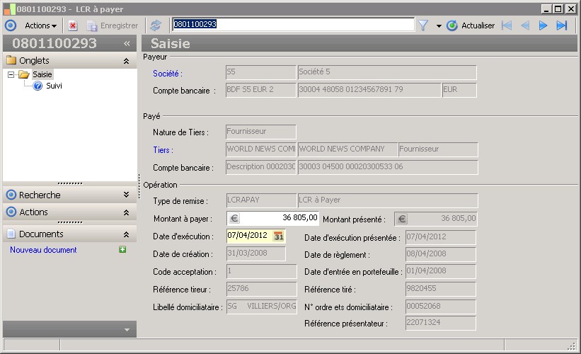 Le montant présenté au paiement correspond au montant de la LCR à payer (montant à payer). |