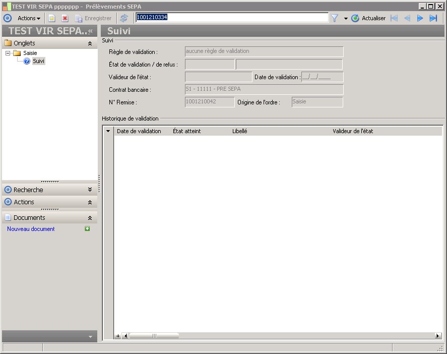 La nature de validation détermine la règle de validation qui sera liée à l'ordre. La nature est elle même déterminée par le groupe de validation associé au rôle du tiers de l'ordre.En l'absence d'une nature de validation, un ordre confirmé est considéré comme valide et peut faire l'objet d'une remise bancaire. |