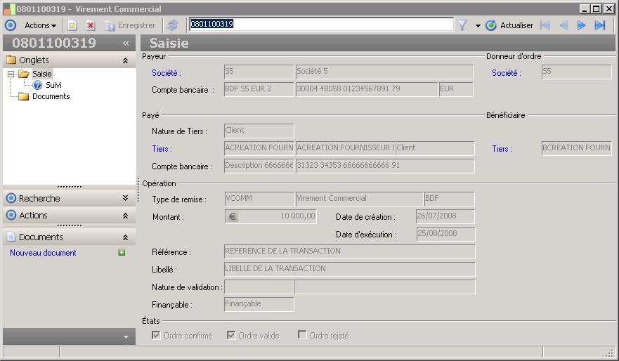 La nature de validation détermine la règle de validation qui sera liée à l'ordre. La nature est elle même déterminée par le groupe de validation associé au rôle du tiers de l'ordre.En l'absence d'une nature de validation, un ordre confirmé est considéré comme valide et peut faire l'objet d'une remise bancaire. |