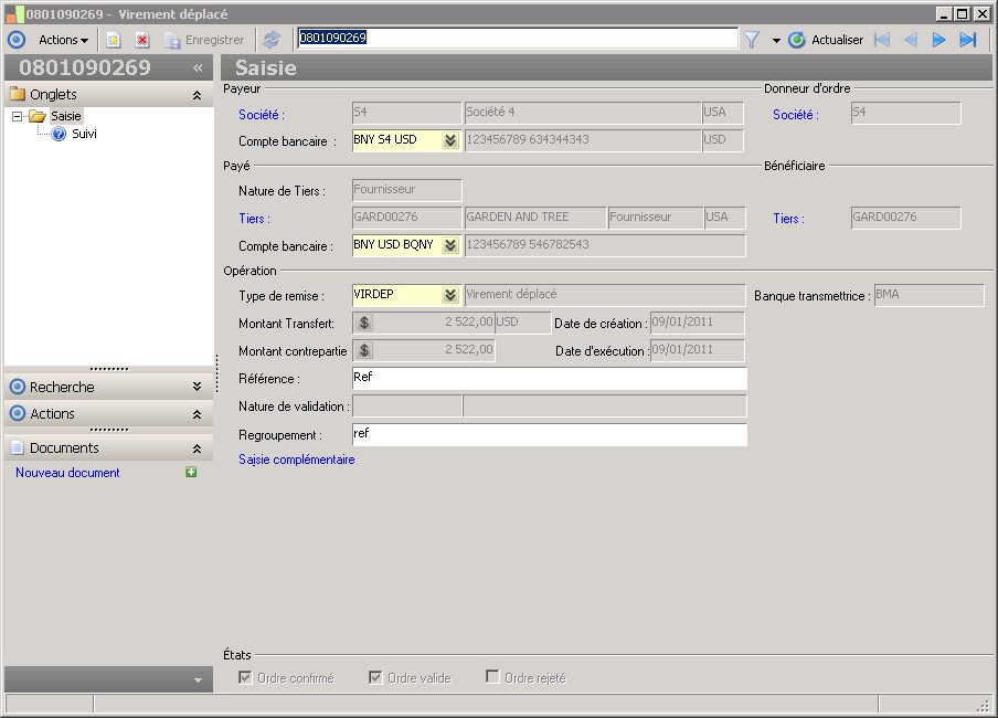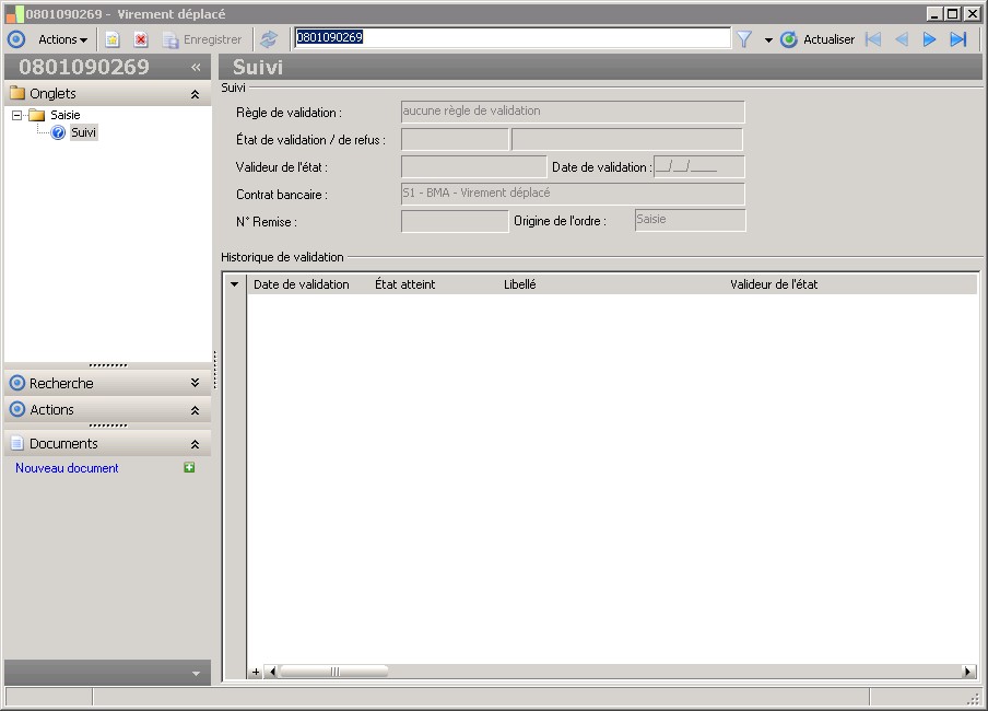 La nature de validation détermine la règle de validation qui sera liée à l'ordre. La nature est elle même déterminée par le groupe de validation associé au rôle du tiers de l'ordre.En l'absence d'une nature de validation, un ordre confirmé est considéré comme valide et peut faire l'objet d'une remise bancaire. |
