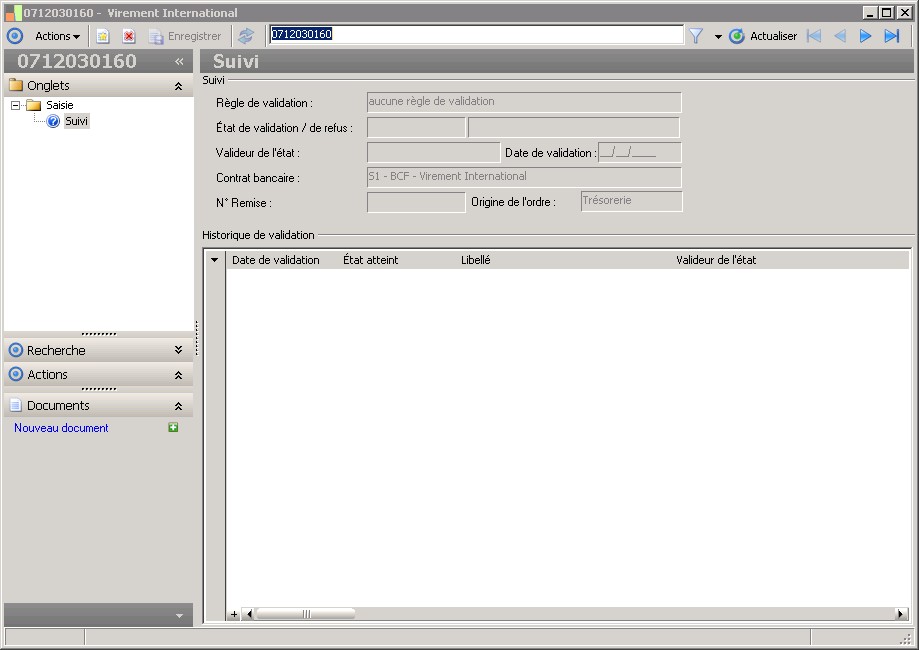 La nature de validation détermine la règle de validation qui sera liée à l'ordre. La nature est elle même déterminée par le groupe de validation associé au rôle du tiers de l'ordre.En l'absence d'une nature de validation, un ordre confirmé est considéré comme valide et peut faire l'objet d'une remise bancaire. |