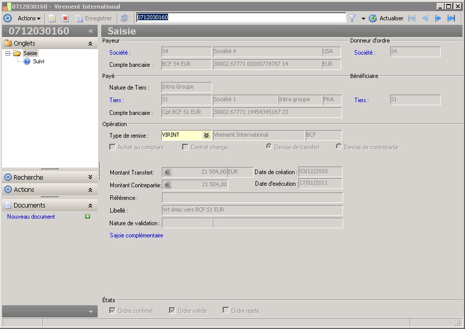 (Sage FRP 1000 Banque Paiement) Menu Banque Paiement > Ordres bancaires > Virement International