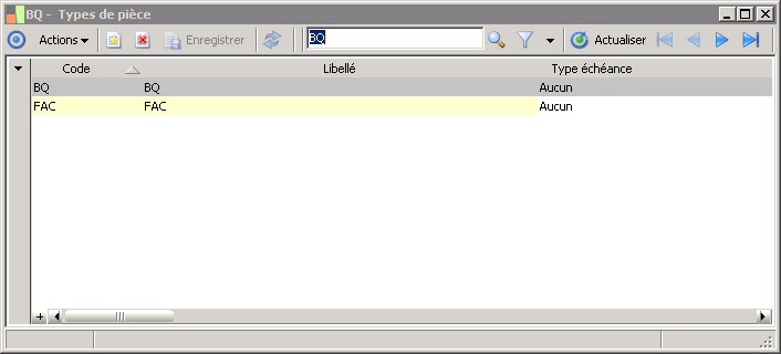 (Sage FRP 1000 Banque Paiement) Menu Banque Paiement > Paramètres > Comptabilisation > Types de pièce