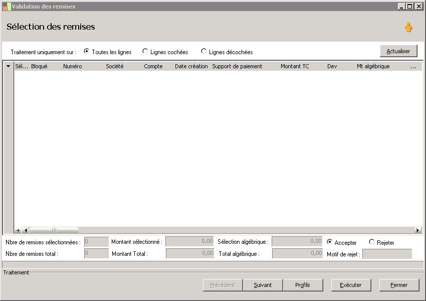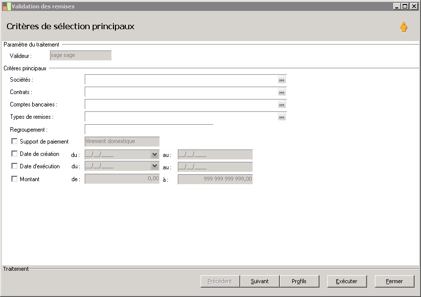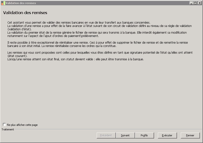 (Sage FRP 1000 Banque Paiement) Menu Banque Paiement > Remises bancaires > Validation des remises