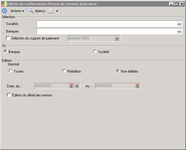 (Sage FRP 1000 Banque Paiement) Menu Banque Paiement > Remises bancaires > Edition de confirmation d'envoi de remises bancaires