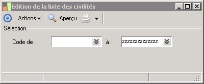 Cette fonction permet d'éditer la liste des civilités en fonction de certains critères de sélection. Elle est lancée par la fonction Impression de la liste et de la fiche des civilités, elles-mêmes accessibles au niveau du menu Paramètres / Société / Civilités.