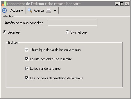 (Sage FRP 1000 Banque Paiement) Menu Banque Paiement > Ordres bancaires > Lancement de l'édition Fiche remise bancaire