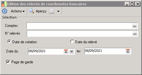 L'édition des relevés de coordonnées bancairespeut être filtrée par comptes bancaires, numéros de relevés, datesde réception et datesde création. Pour consulter les relevés, cliquer sur le bouton Aperçu . Pour les imprimer, sélectionner Imprimer dans le menu de l'icône Imprimante.