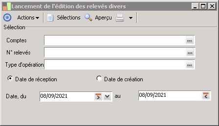 Vous pouvez sélectionner les relevés par comptes, numéros de relevés, type d'opération, et date de réception ou de création. Pour consulter les relevés issus de la sélection, cliquer sur le bouton Aperçu. Pour imprimer les relevés, cliquer sur le bouton/menu Imprimer.