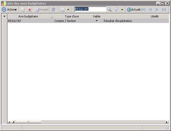 Cet écran vous présente la liste des axes budgétairesd'exploitation, en précisant pour chacun leur code et leur libellé.