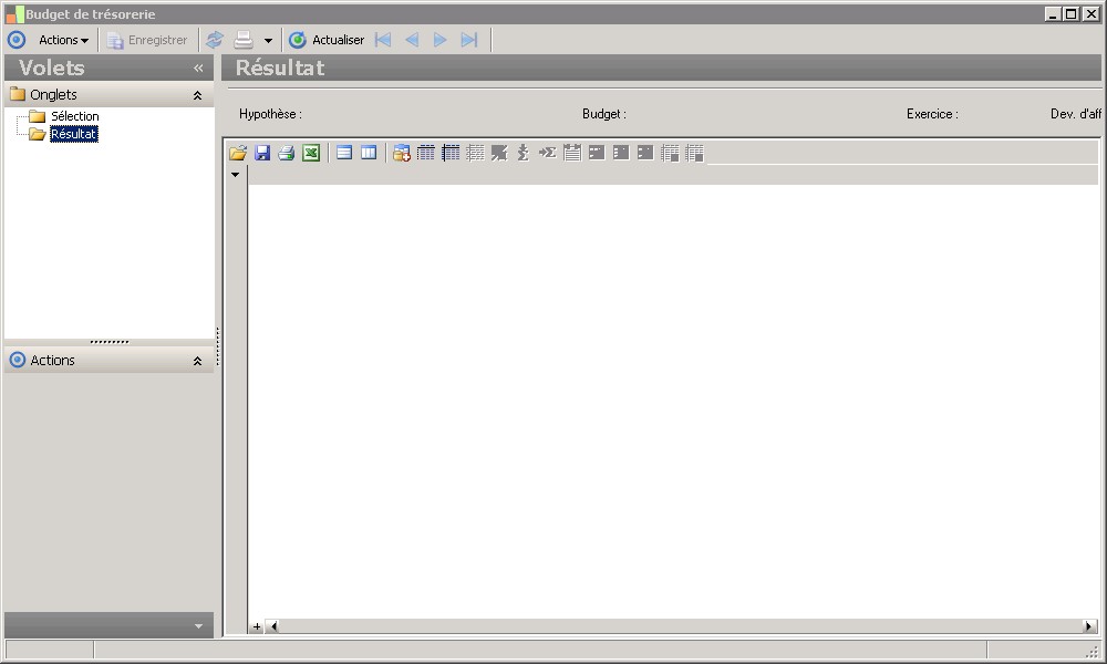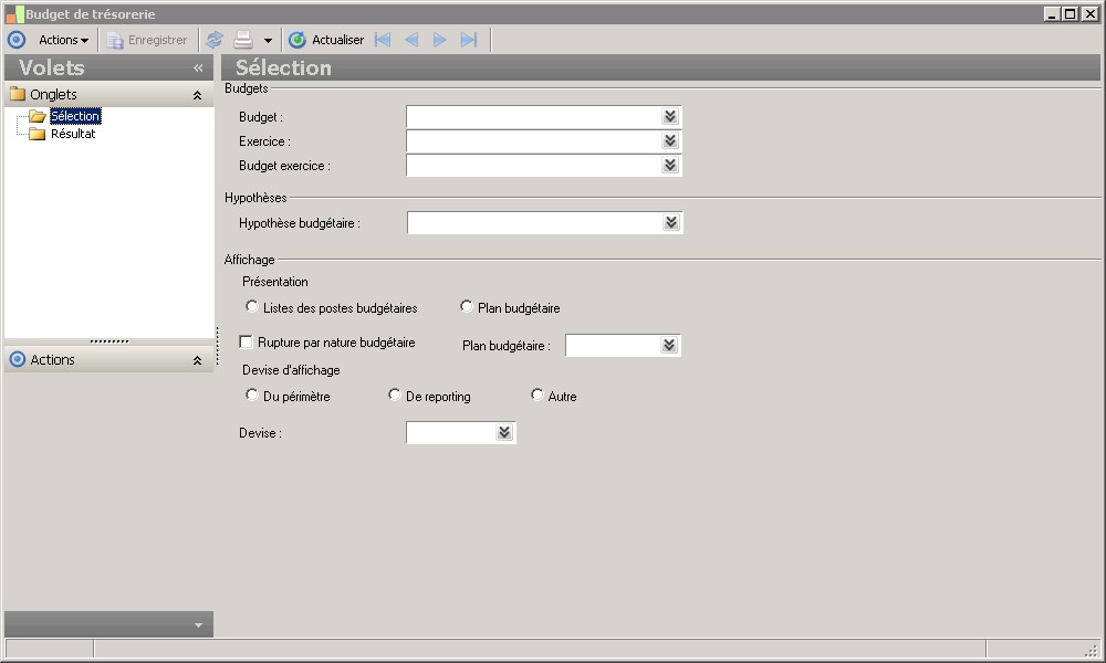Après activation du bouton Actualiser, l'entrée Résultat vous présente le budget de trésorerieselon les critères définis dans l'entrée Sélections.