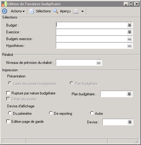 (Sage FRP 1000 Comptabilité) Menu Budget >  Analyses >  Edition de l'analyse budgétaire