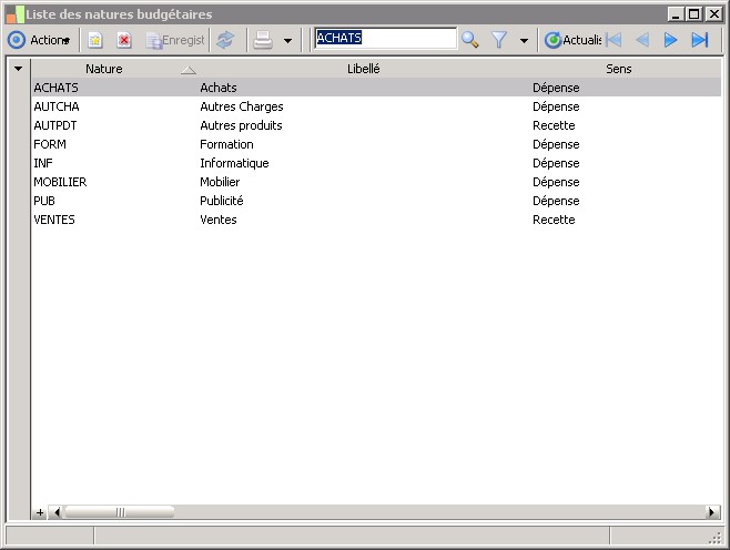 Cet écran vous présente la liste des natures budgétaires, en précisant pour chacune leur code, leur libellé et leur sens.