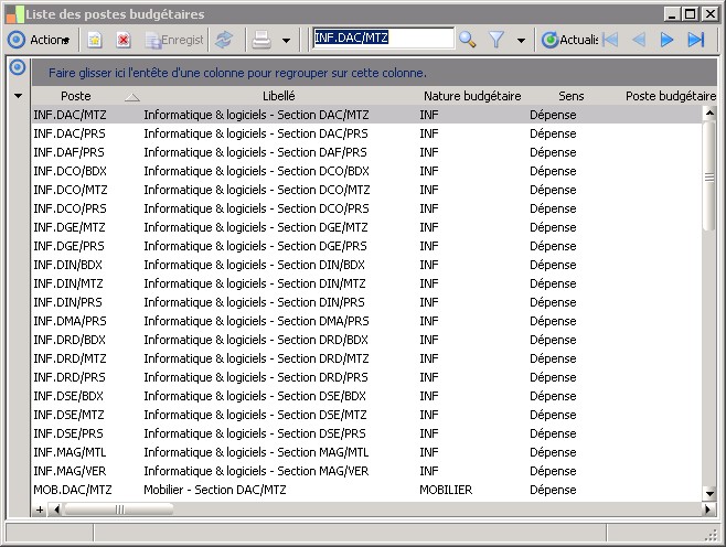 (Sage FRP 1000 Comptabilité) Menu Budget > Paramètres > Liste des postes budgétaires