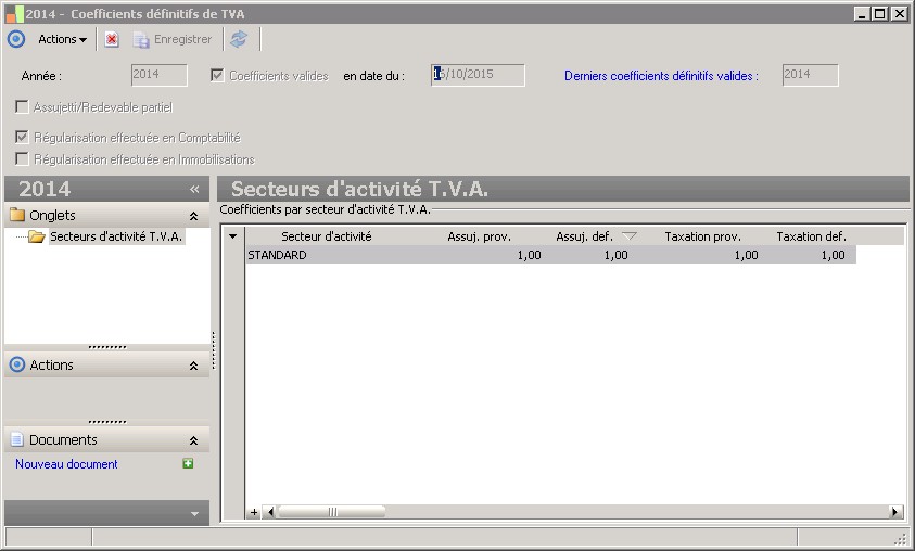 Il s'agit de la valeur du coefficient de taxation définitif pour le secteur d'activité correspondant et pour l'année civile en cours de régularisation.Par défaut, le coefficient définitif est égal au coefficient provisoire, mais il reste bien sûr modifiable tant qu'il n'y a pas eu de validation des coefficients définitifs. |
