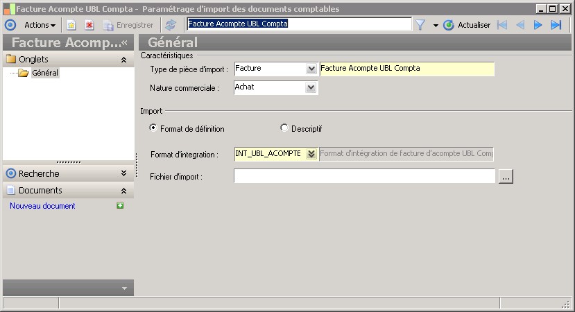 (Sage FRP 1000 Comptabilité) Menu Immobilisations > Initialisation > Import du suivi comptable > Paramétrage d'import des documents comptables