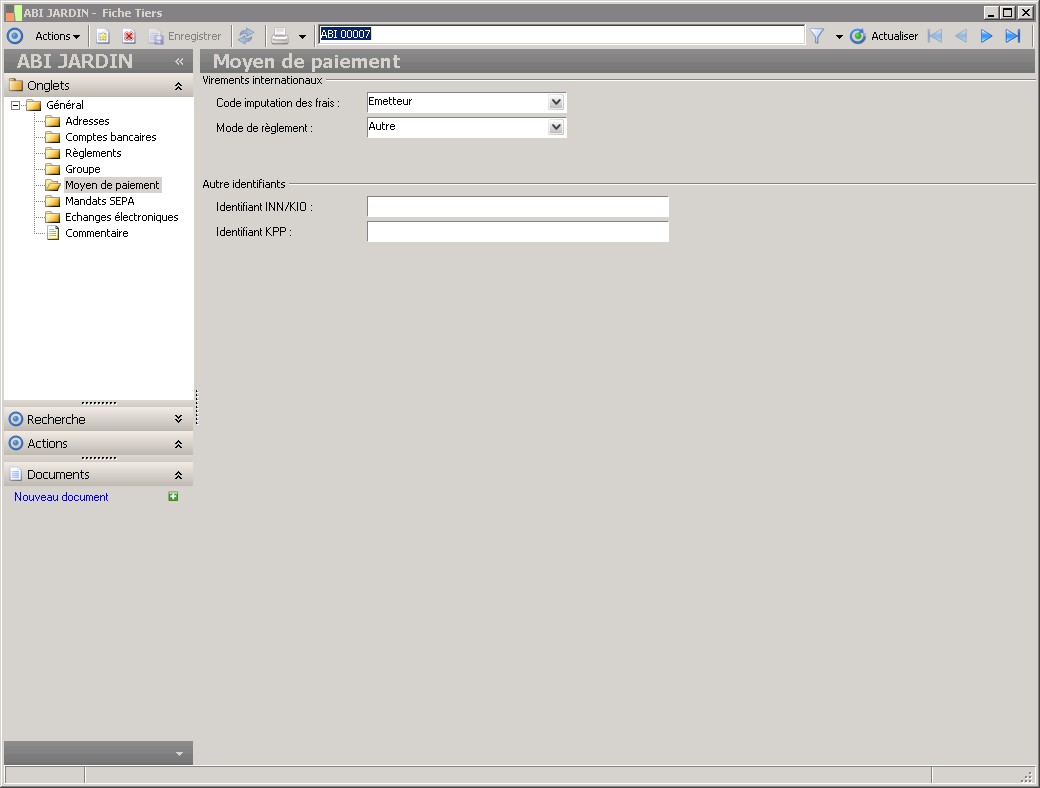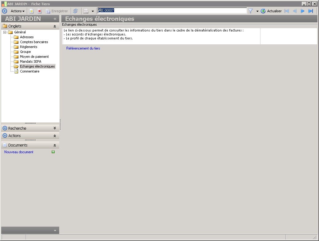 Dans la fenêtre Fiche Tiers, la présence des fonctions décrites dans ce contexte dépend des applications installées. |