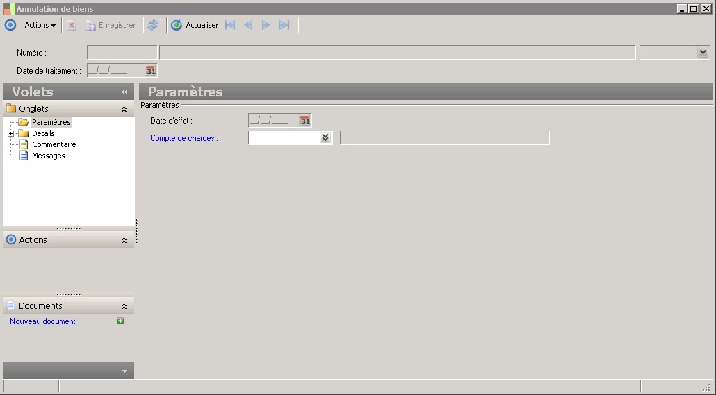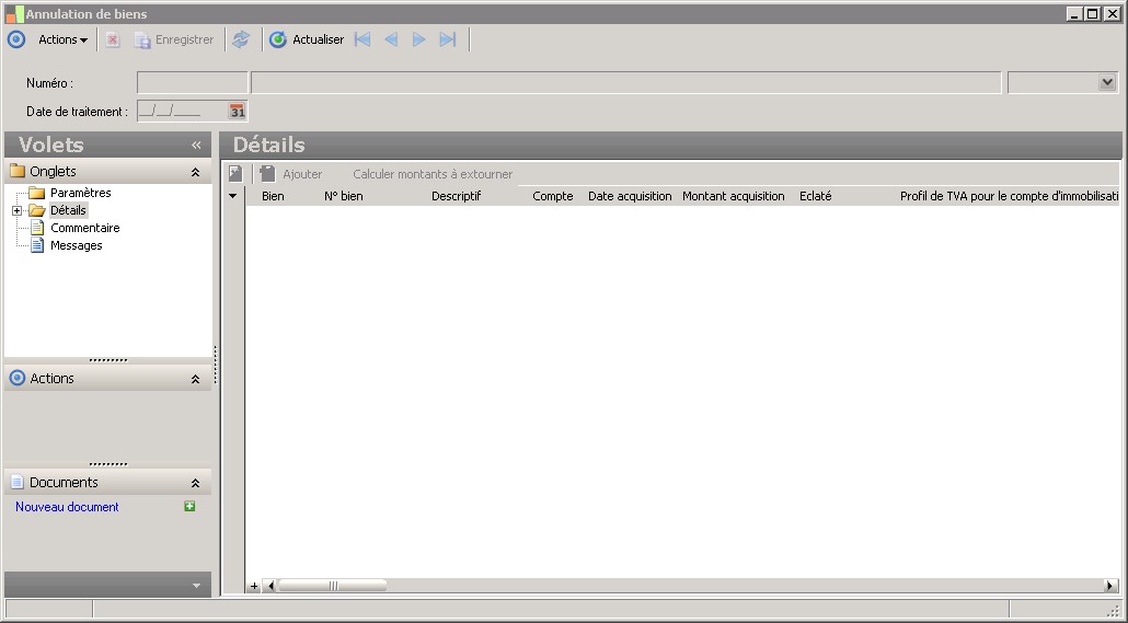 (Sage FRP 1000 Comptabilité) Menu Immobilisations > Suivi comptable > Biens > Annulation de biens
