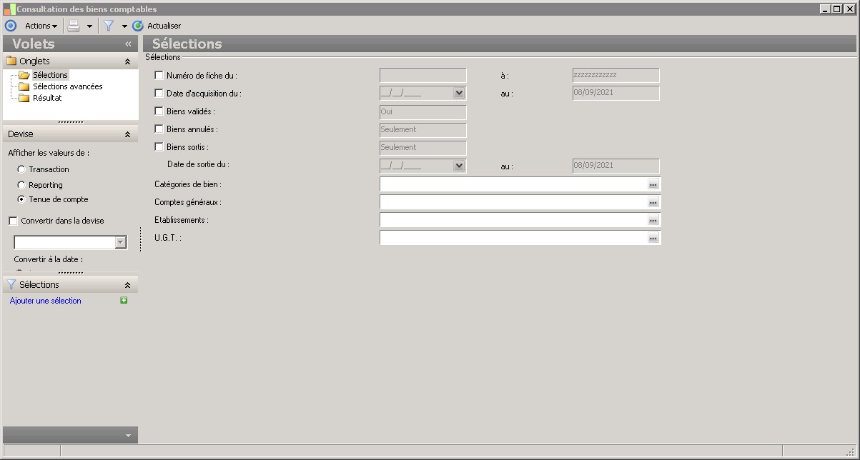 (Sage FRP 1000 Comptabilité) Menu Immobilisations > Restitutions > Biens > Consultation des biens comptables