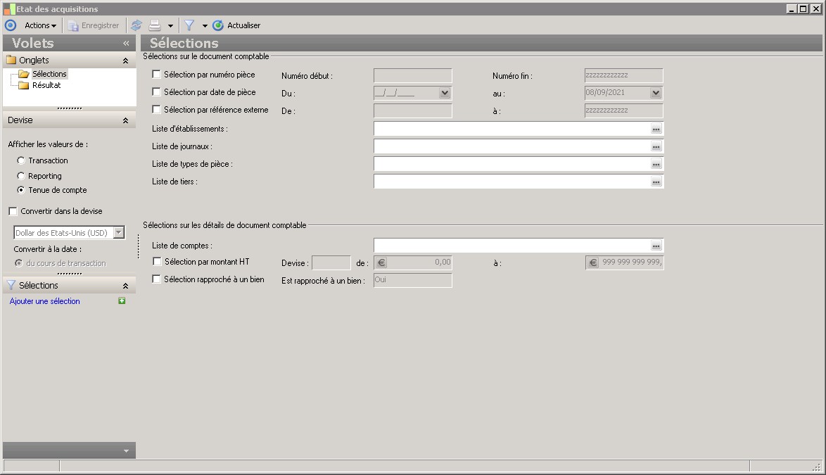 (Sage FRP 1000 Comptabilité) Menu Immobilisations > Acquisitions > Etat des acquisitions
