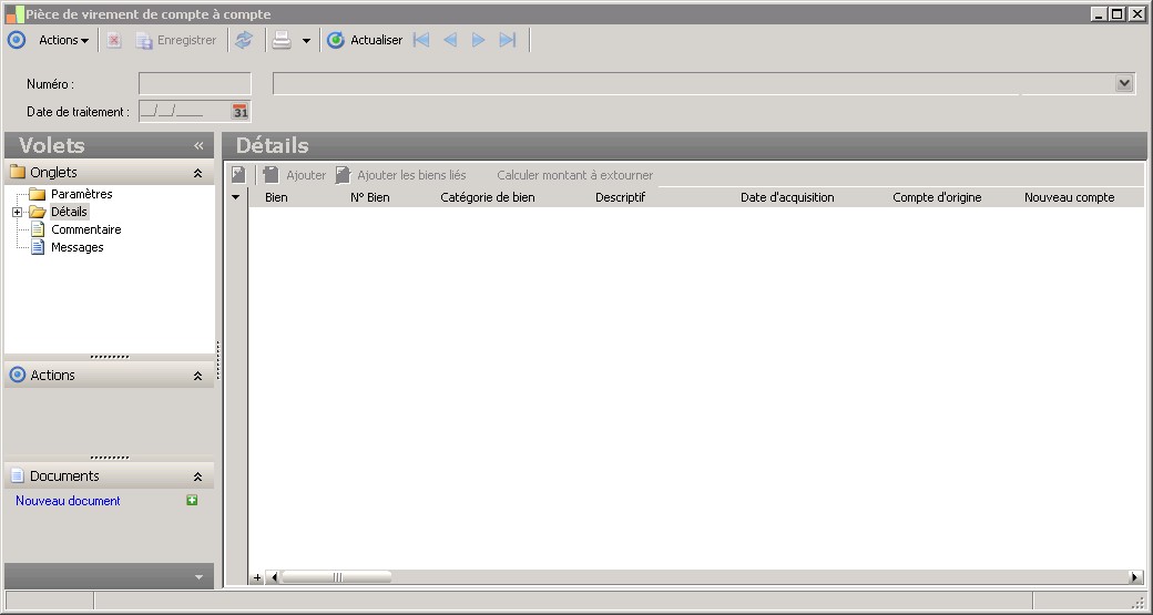 (Sage FRP 1000 Comptabilité) Menu Immobilisations > Suivi comptable > Biens > Pièce de virement de compte à compte