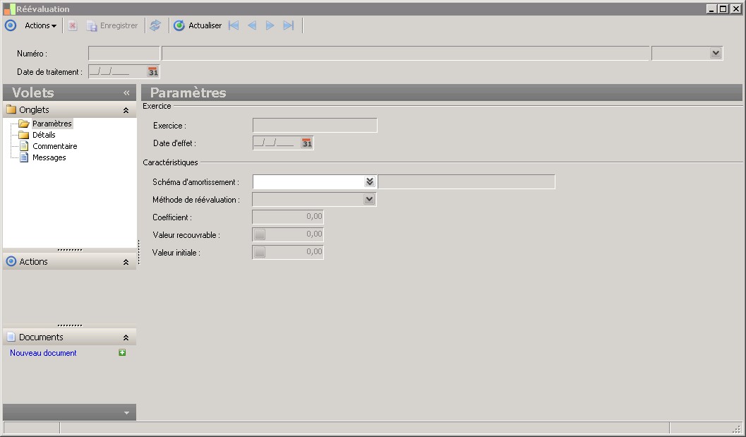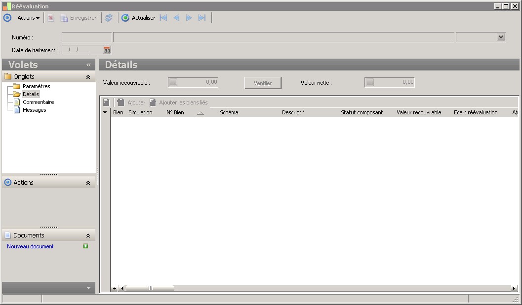 Cette zone permet de saisir le montant de la valeur recouvrable en cas de dépréciation ou de réévaluation. |