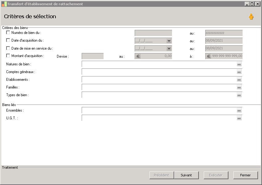 (Sage FRP 1000 Comptabilité) Menu Immobilisations > Suivi comptable > Etablissement > Transfert d'établissement de rattachement