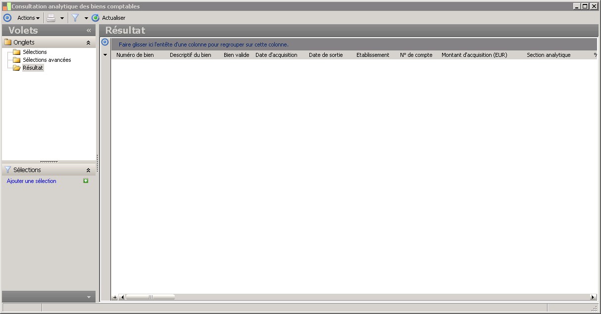 (Sage FRP 1000 Comptabilité) Menu Immobilisations > Restitutions > Biens > Consultation analytique des biens comptables