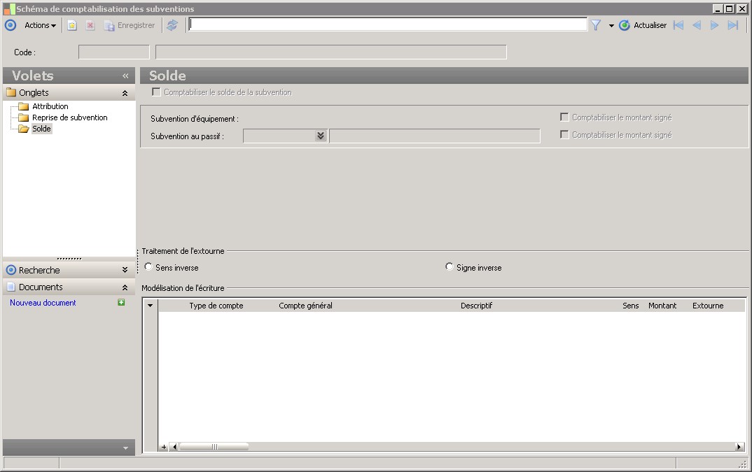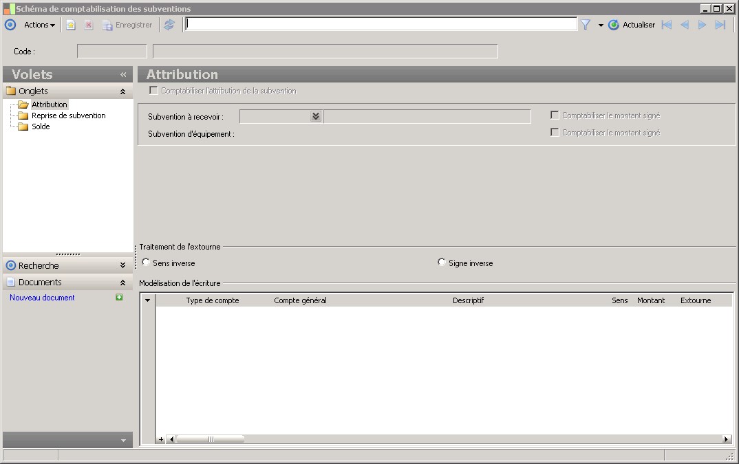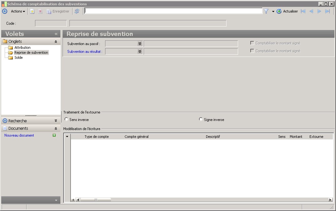 Attention, vous devez impérativement renseigner tous les comptes d'un schéma de comptabilisation, y compris ceux qui n'apparaissent pas comme étant obligatoires. Ceci est nécessaire pour le traitement de comptabilisation des subventions. |