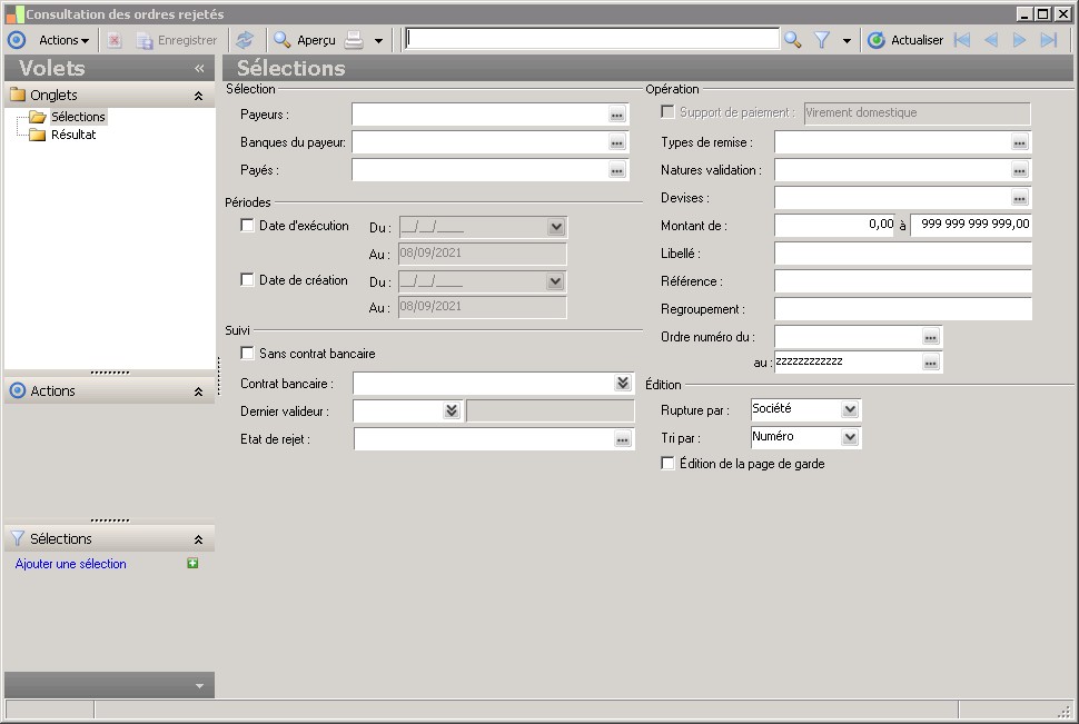 (Sage FRP 1000 Comptabilité) Menu Banque Paiement > Ordres bancaires > Consultation des ordres rejetés