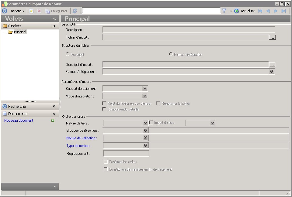 (Sage FRP 1000 Comptabilité) Menu Banque Paiement > Paramètres > Paramètres d'import de Remise