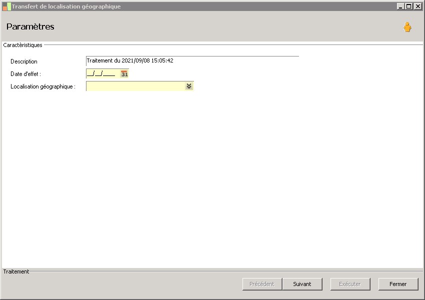 (Sage FRP 1000 Comptabilité) Menu Immobilisations > Suivi physique > Localisation géographique > Transfert de localisation géographique
