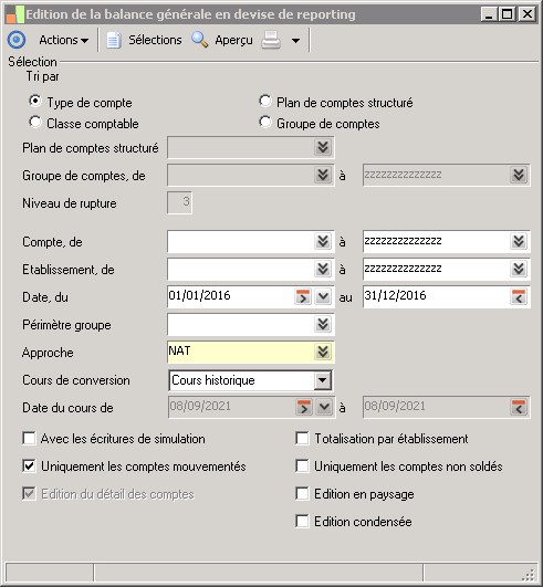 (Sage FRP 1000 Comptabilité) Menu Comptabilité > Générale > Editions comptables > Edition de la balance générale en devise de reporting
