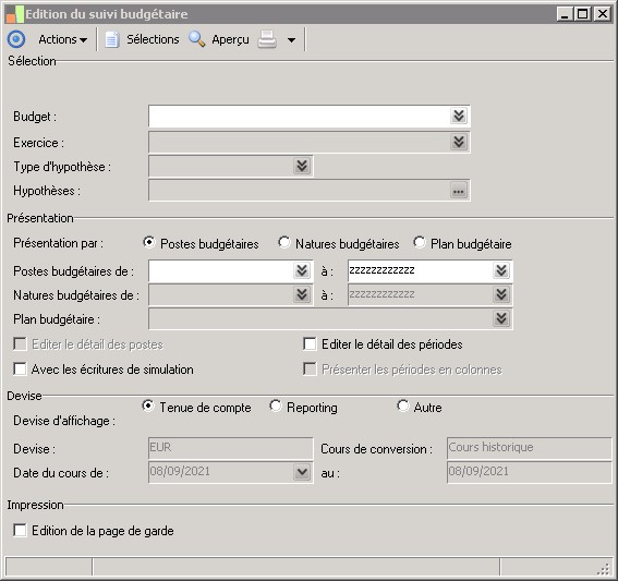 Cette fenêtre permet d'obtenir une édition du suivi budgétaire en fonctiond'un budget, une période et une hypothèse budgétaire.